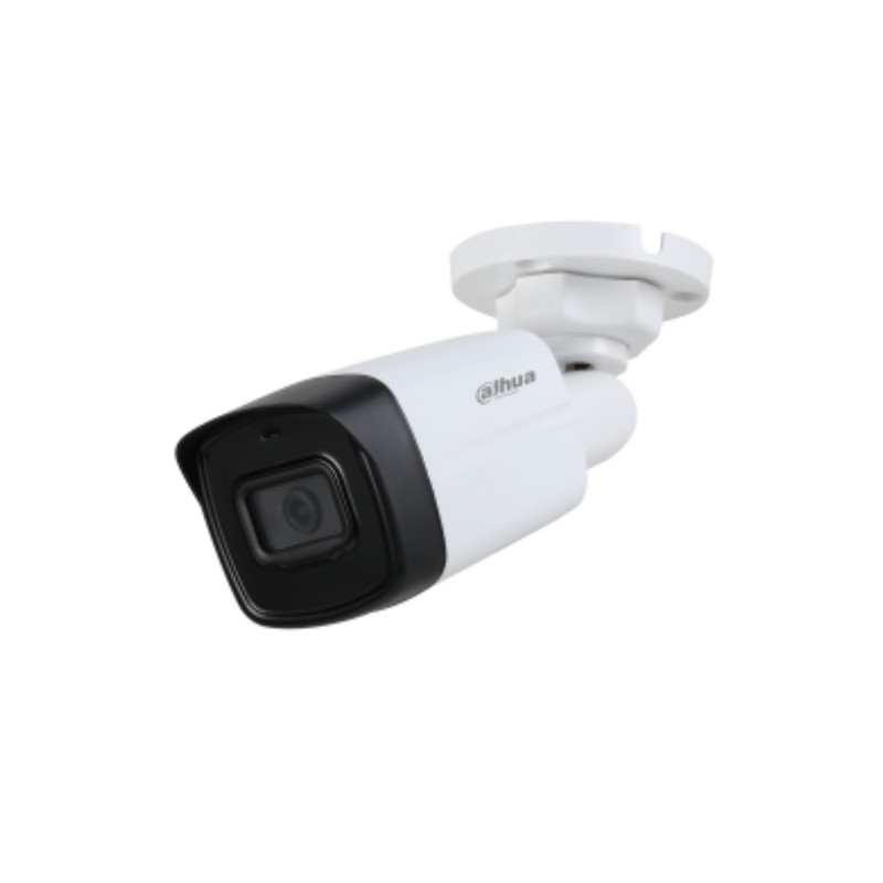Cámara Bullet HDCVI 5MP con lente fija 2.8mm, IR y micrófono integrado. Compatible con HDCVI/AHD/HDTVI/CVBS. Alimentación 12VDC. Ideal para interiores y exteriores.