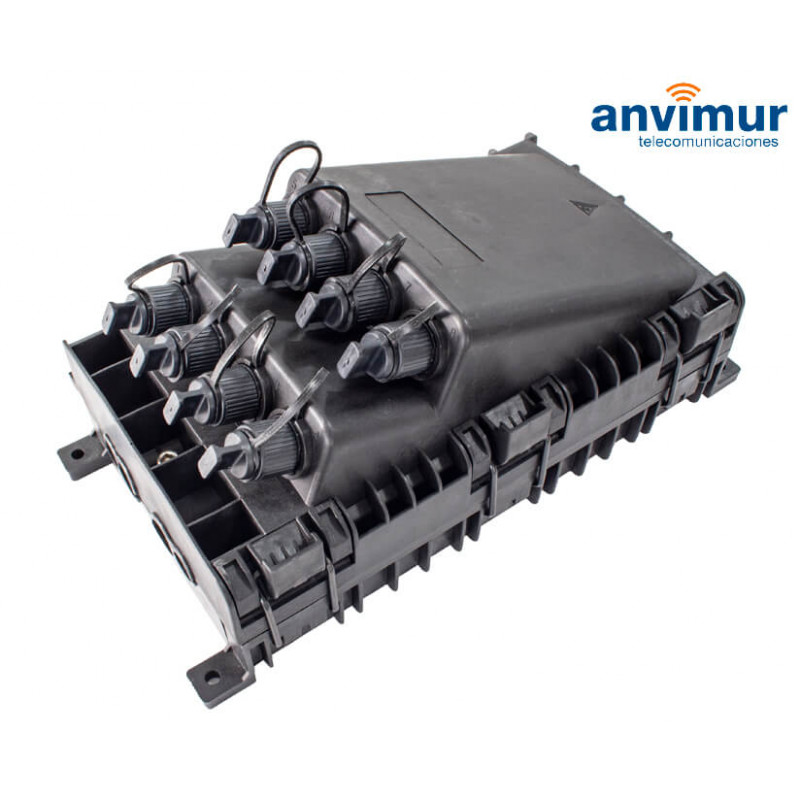 Caja Distribución (CD). Cuenta con 4 puertos entrada/salida Ø<16mm (2 puertos: para 1 cable con un máximo de 16mm y 2 puertos: para 1 cable con un máximo de 13mm) + 8x adaptedores WSC/APC SX estancos y capacidad para 36 fusiones (1x bandeja de 12 empalmes y alojar 2x Splitter PLC + 1x bandeja de 24 empalmes). Posibilidad de instalar en Pared. Protección IP65.