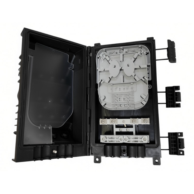 Caja Distribución (CD). Cuenta con 4 puertos entrada/salida Ø<16mm + 16 adaptadores WSC/APC SX estancos y capacidad para 36 fusiones (1x bandeja de 12 empalmes y alojar 2x Splitter PLC + 1x bandeja de 24 empalmes). Posibilidad de instalar en Pared. Protección IP65.